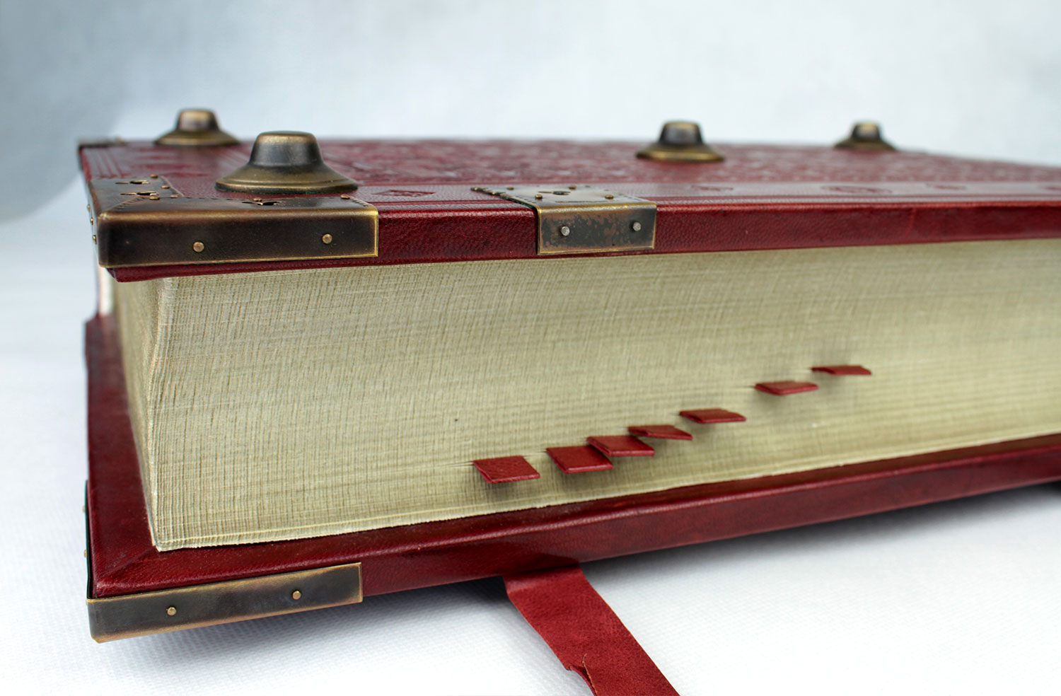 Oprawa: dębowe deski obciągnięte bordową skórą, mosiężne guzy, narożne okucia i klamry umocowane na skórzanych pasach