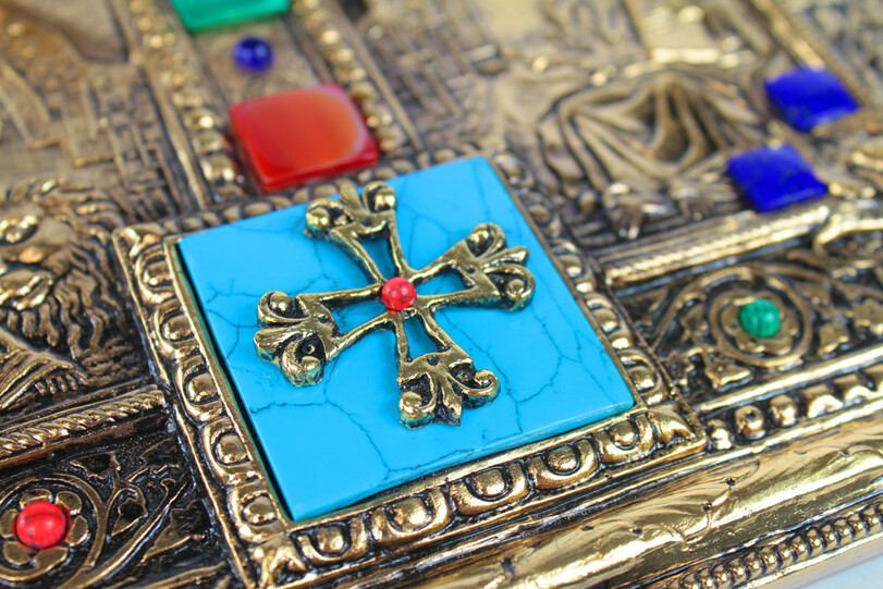 Zdobienie: 53 kamienie jubilerskie: szafirowy kryształ - 8 sztuk, malachit - 15 sztuk, turkus - 12 sztuk, koral - 18 sztuk, iluminacje uszlachetniane ręcznie nanoszonym 24-karatowym złotem płatkowym