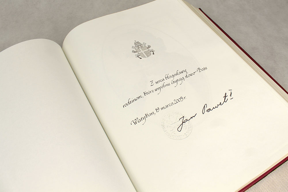 Pierwsze w Polsce, współczesne, oficjalne tłumaczenie Pisma Świętego z języków oryginalnych dokonane przez jednego tłumacza w niezwykłej, drogocennej jubilerskiej oprawie. Unikatowe Wydanie Jubileuszowe z komentarzami św. Jana Pawła II.